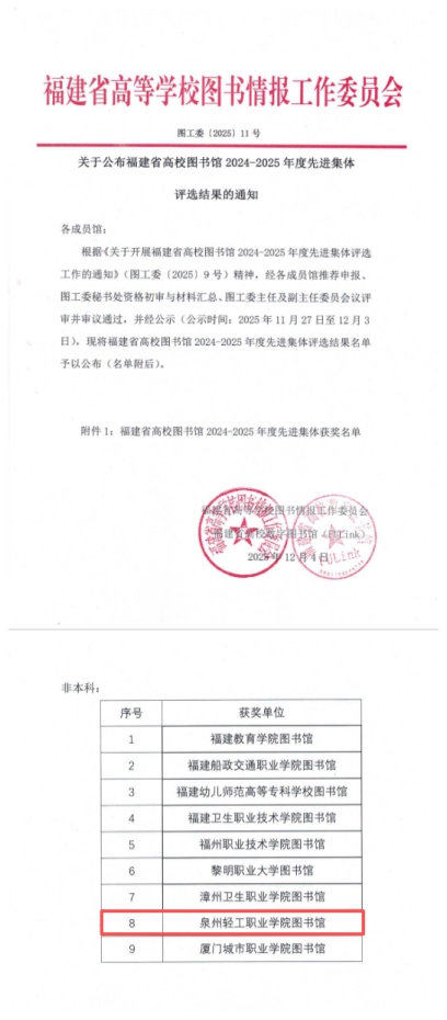 喜报!泉州轻工职业学院图书馆获评“ 福建省高校图书馆2024-2025年度先进集体”